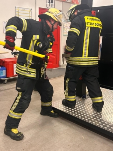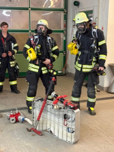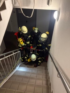 Im Zuge der letzten Atemschutzübung wurde sich außerdem mit der Rettung von verunfallten Atemschutzgeräteträgern befasst. Hierzu wurde die richtige Bereitstellung des Sicherungstrupps, so wie die Transportmöglichkeit von verunfallten Atemschutzgeräteträgern besprochen.